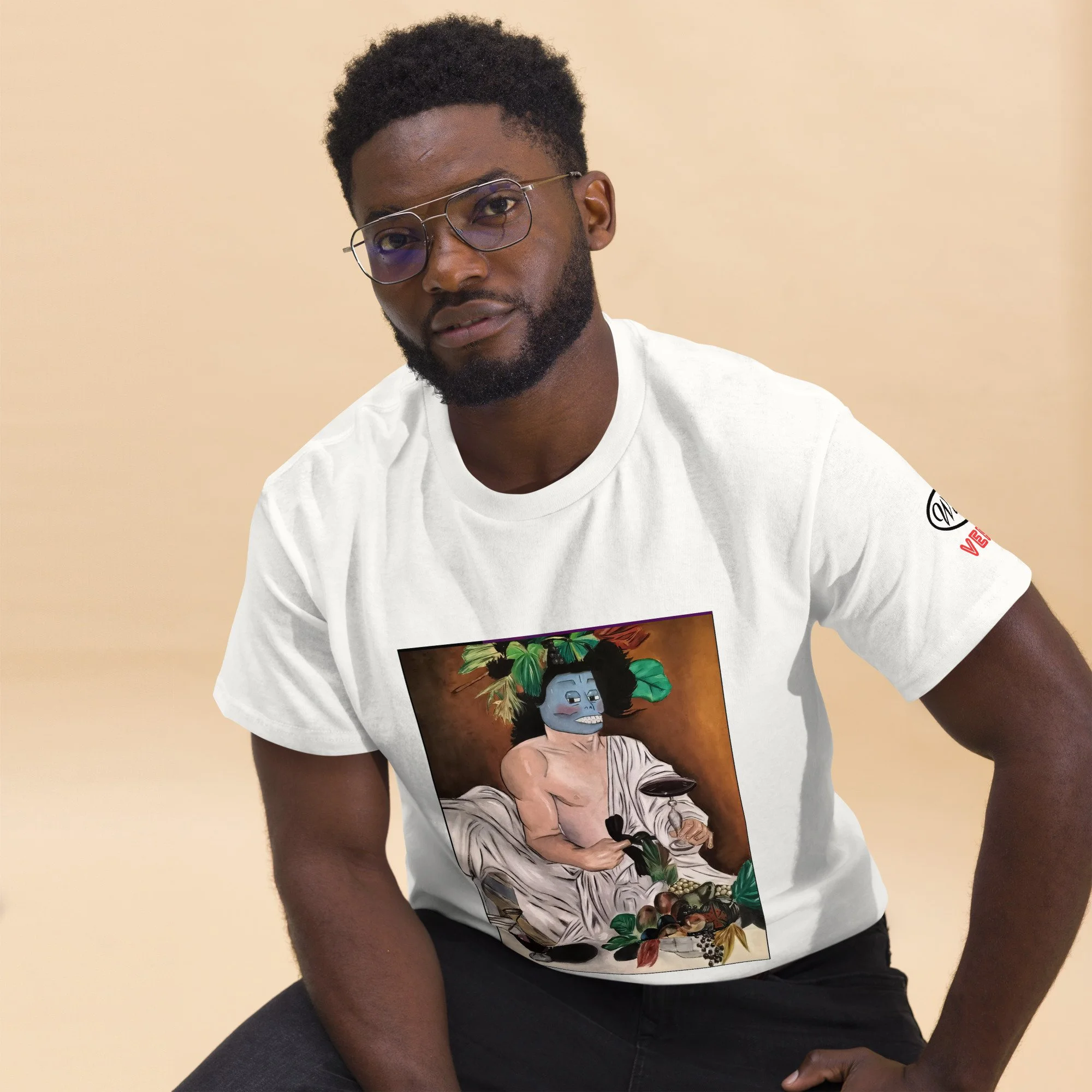 This shirt reimagines Caravaggio’s “Bacchus” (1596–1597), where the god of wine and excess is reborn with Whiskey’s unmistakable face.
